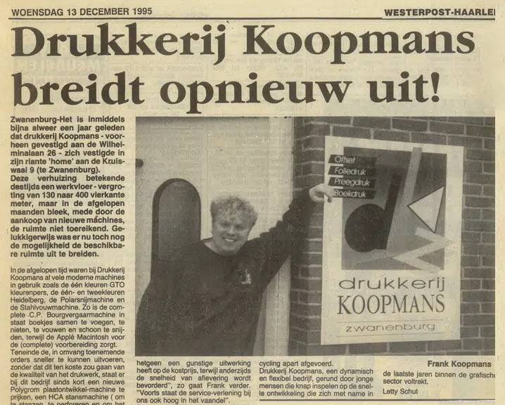Wat in 1965 begon als een kleine drukkerij in een schuurtje in Amstelveen, is uitgegroeid tot een toonaangevend grafisch bedrijf dat een breed scala aan print- en drukwerkoplossingen biedt. Onze oprichters, Tini en Henk Koopmans, legden de basis voor wat inmiddels een modern en veelzijdig familiebedrijf is geworden. Via Amsterdam verhuisden we naar Zwanenburg, waar we eerst gevestigd waren aan de Wilhelminalaan en later aan de Kruiswaal. In 2008 zetten we de stap naar onze huidige locatie aan de Venenweg, waar we sindsdien meerdere uitbreidingen hebben gerealiseerd.