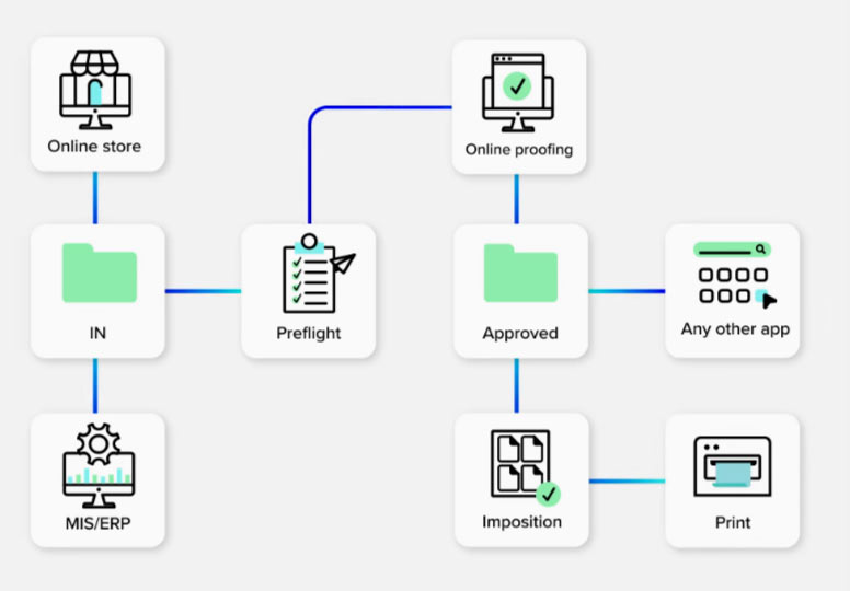 Naast technologische investeringen hebben we ook ons productieproces vergaand geautomatiseerd. Orders worden direct vanuit onze klantenportal doorgestuurd naar onze interne Pitstop-workflow en waar eventuele aanpassingen automatisch worden doorgevoerd. We werken ook met Enfocus Switch. Switch automatiseert herhalende taken en integreert alle grafische software. Dankzij slimme koppelingen met externe bestelsystemen kunnen wederverkopers hun drukwerk eenvoudig via hun eigen platform bestellen, waarna wij de volledige productie en verzending verzorgen.